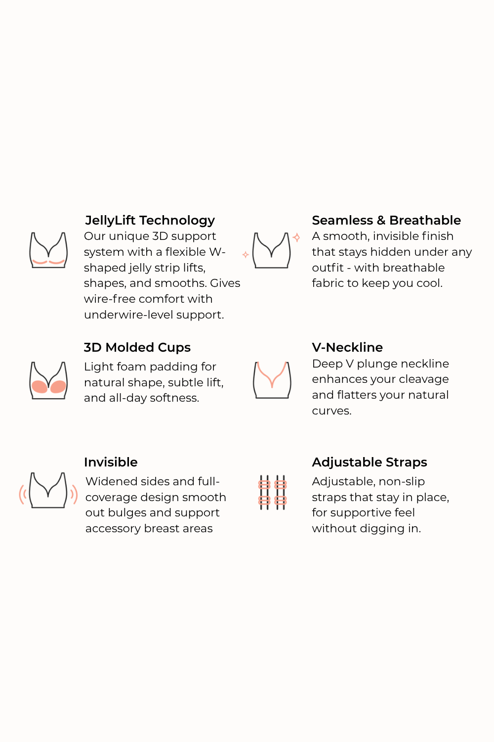 Discover ultimate comfort and style with our Seamless Soft V-Neck Wireless Jelly Bra, designed to lift, shape, and support – all without the discomfort of underwire. Featuring innovative W-shaped jelly strips and a 3D cup design, this bra delivers natural lift and enhances your silhouette while staying virtually invisible under clothing.